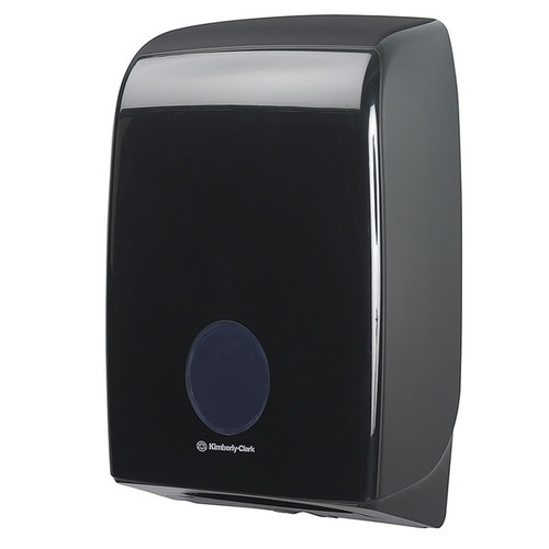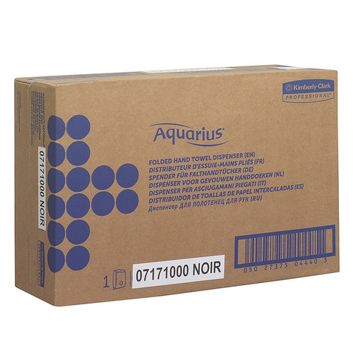 Create a hygienic and coordinated washroom experience with the Aquarius dispenser range, designed to work in perfect harmony with the trusted and familiar Kleenex and Scott brands. These washroom dispensers are designed to support hygiene standards and deliver a consistent washroom solution suited to your workplace hygiene needs. Our Aquarius folded hand towel dispenser pairs innovation and style with exceptional performance. This paper hand towel dispenser has a sleek and smooth rounded design with no dirt traps, allowing an easy one-wipe-clean for improved washroom hygiene. The fully enclosed dispenser system ensures you only touch the product you use to help support high hygiene standards in the workplace. The high capacity of this paper towel dispenser, helps ensure there˜s always product available. Refilling the folded towel dispenser is simple and the Hassle-free maintenance keeps costs down in areas of heavy use. Jamming, wastage and costs are minimised by the unique, patented overfilling device of this hand towel dispenser which ensures a smooth dispensing experience. This folded paper towel dispenser delivers single sheet interfold, also known as V fold, dispensing which helps to reduce overuse. The Aquarius folded hand towel dispenser features a hidden lock for refilling and a window to help you anticipate the towels running out. Our touch free dispensers reduce the risk of cross contamination.The black Aquarius folded paper hand towel dispenser is also available in white (code 6945), to suit all washrooms. This commercial paper towel dispenser measures 39.9cm (L) x 26.5cm (W) x 13.6cm (D). The Kimberly-Clark dispenser is compatible with a variety of Kleenex and Scott folded hand towels from Kimberly-Clark, recommended: 6710, 6659, 6663, 6669, 6677, 6682, 6778, 6789, 3749, 4632. It is also compatible with: 6633, 6647, 6649, 6664, 6689, 6764, 6771, 6772, 6773, 6777, 7979. 1 x Aquarius Folded Hand Towel Dispenser - Black