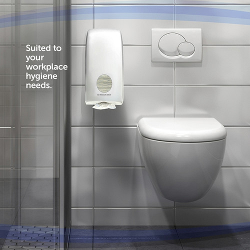 Create a hygienic and coordinated washroom experience with the Aquarius dispenser range, designed to work in perfect harmony with the trusted and familiar Kleenex and Scott brands. These washroom dispensers are designed to support hygiene standards and deliver a consistent washroom solution suited to your workplace hygiene needs. Our Aquarius folded toilet tissue dispenser pairs innovation and style with exceptional performance. This toilet paper dispenser has a sleek and smooth rounded design with no dirt traps, allowing an easy one-wipe-clean for improved washroom hygiene. The fully enclosed single sheet toilet paper dispenser system and its effective single sheet dispensing ensures you only touch the product you use, helping to reduce cross contamination. The single sheet toilet tissue dispenser provides a refillable, reliable, anytime top up solution for washroom maintenance. Refilling the dispenser is simple and the Hassle-free maintenance keeps costs down. Jamming, wastage and costs are minimised by the unique, patented overfilling device of this folded toilet paper dispenser which ensures a smooth dispensing experience. This Aquarius toilet tissue dispenser features a hidden lock for refilling and a window to help you anticipate the tissues running out. Our touch free dispensers reduce the risk of cross contamination. The white Aquarius folded toilet paper dispenser is also available in black (code 7172) and dual version (white 6990) options to suit all washrooms. This commercial toilet paper dispenser measures 34.1cm (L) x 16.9cm (W) x 12.3cm (D). The Kimberly-Clark dispenser is compatible with a variety of Kleenex and Scott folded toilet tissue packs from Kimberly-Clark, recommended: 8042, 8408. It is also compatible with: 8577, 8035, 8036, 8042, 8407, 8508, 8509, 4477, 8409, 4471. 1 x Aquarius Folded Toilet Tissue Dispenser - White