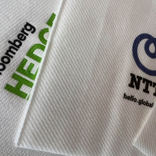 If your looking for a more luxury napkin and are planning an event or private function for your business then our premium airlaid printed dinner napkins are perfect. Printing on airlaid napkins are a cost effective way of adding that finishing touch of quality to any promotional catering event. Our luxury custom printed dinner napkins are 40cm square folded out (20x20cm folded) and are extremely eco friendly; 100% recyclable / compostable and biodegradable. Can be printed in full colour CMYK on to a range of soft coloured tissue. Our airlaid dinner napkins are available in white, other colours available; please contact us.