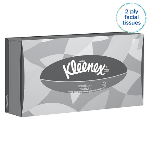 Uplift your washroom experience with the trusted and familiar Kleenex brand, designed to deliver an unrivalled experience whilst supporting high hygiene standards in the workplace. Kleenex tissues are soft and luxurious, providing elevated care. Each box of tissues contains high quality, soft, strong and absorbent 2 ply tissues. The face tissues are packed in a stylish standard sized facial tissue box. These tissue boxes are perfect for desks, meeting rooms and communal areas, providing a hygienic way to catch and bin germs. The standard sized Kleenex tissue boxes are compatible with the Kimberly-Clark Professional silver facial tissue dispenser (product code 7820) and also fit most standard flat box facial tissue dispensers. Produced from 100% virgin fibres, this facial tissue paper carries the FSC (Forest Stewardship Council) certification. These forests are managed to meet the social, economic and ecological needs of present and future generations. These Kleenex tissues are part of range of facial tissue boxes by Kimberly-Clark Professional. 21 cartons x 100 sheets, 2 ply, white, individual sheet size 21.5cm (L) x 18.6cm (W), (2,100 total)