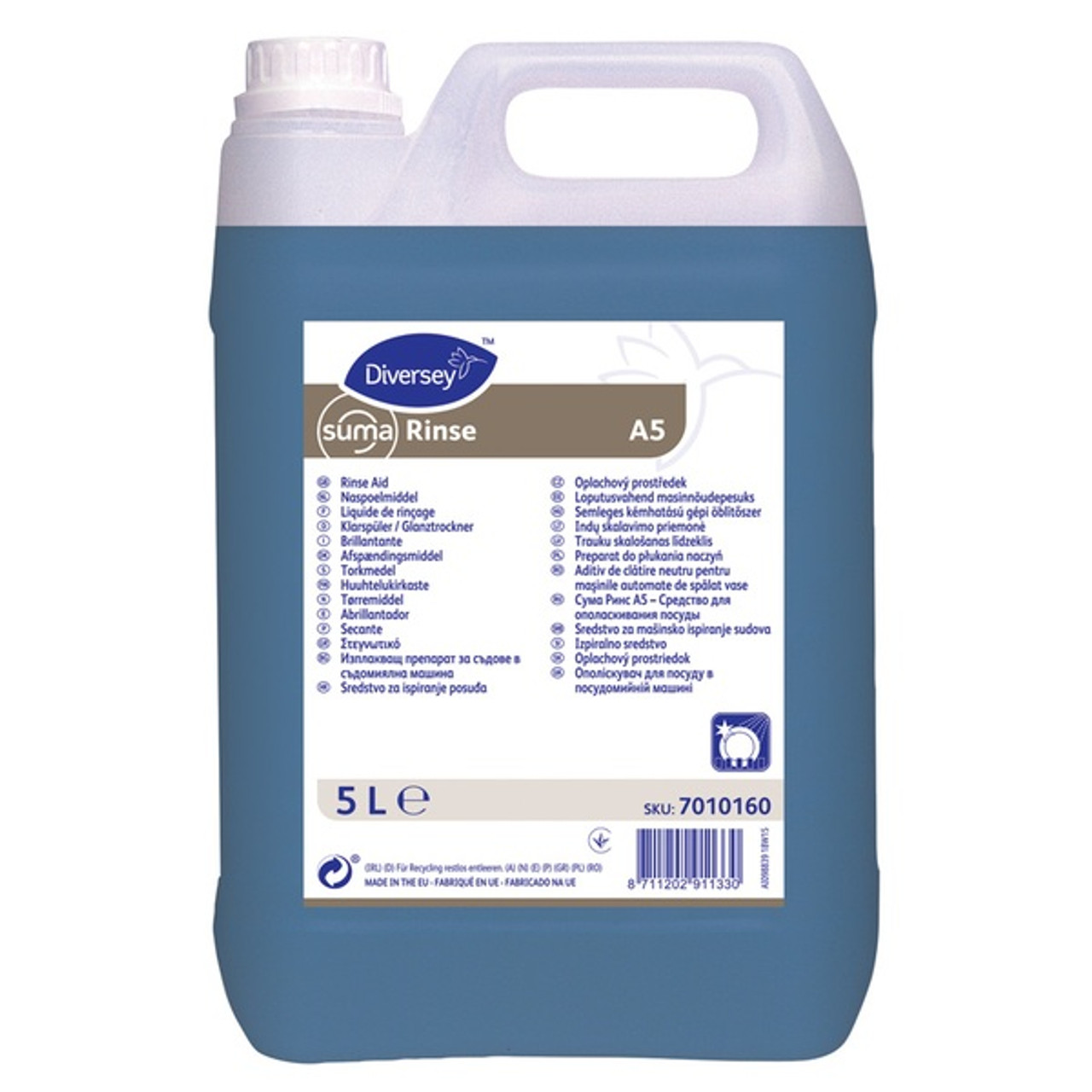 Supplied in SafePack packaging, providing a closed system with unique colour coded key connectors to prevent personal exposure and reduce confusion. Suma Rinse A5 is a standard neutral rinse additive. It has been specially formulated for use in a wide range of ware washing machines. The product contains a special blend of nonionic surfactants for rapid, spot and streak free drying on all cleaned surfaces in soft and medium hard water conditions.