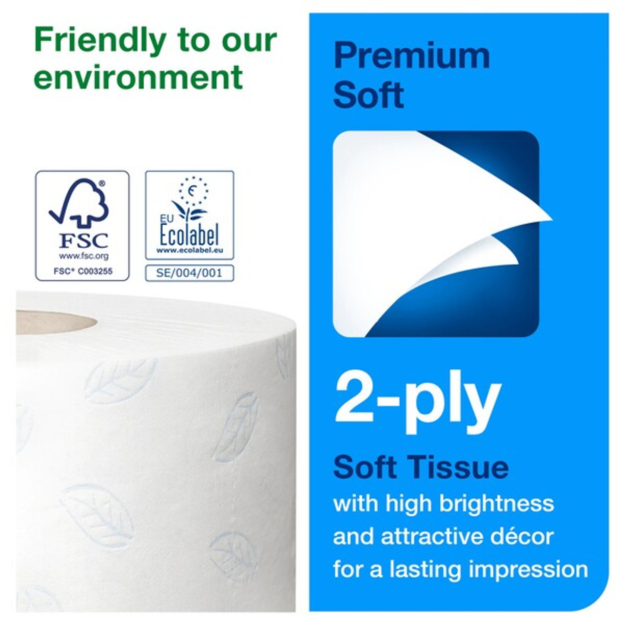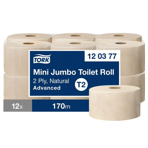 Tork Mini Jumbo Toilet Roll Natural T2: Save time and money with our 2-ply Tork Mini Jumbo Toilet Roll. Ideal for medium- to high-traffic washrooms, it contains much more toilet tissue than standard rolls, meaning fewer refills for you and your staff. Guests are also left with a positive experience the perforated tissue makes it easy for users to take exactly what they need. The light brown colour comes from using recycled cardboard boxes as one of the fibre sources. No dyes are added in the paper-making. Reduce the risk of paper shortages, too, by using one of our high-capacity toilet roll dispensers.Advantages at a glance: Jumbo size to balance cost and performance. High-capacity dispenser for less maintenance. Sustainable refills in a light brown colour. Easy-to-use perforated tissue. Attractive design. Suitable for medium- to high-traffic locations.
