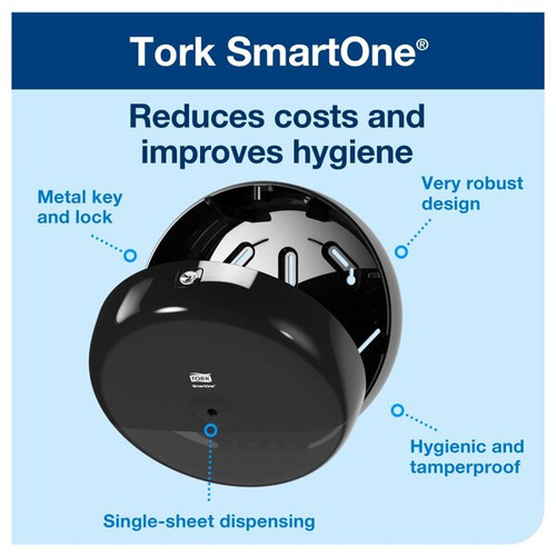When it comes to maintenance, high-traffic washrooms can be costly and time-consuming. Our Tork SmartOne Toilet Roll Dispenser is a modern and efficient solution. It uses single-sheet dispensing to cut paper use by up to 40% compared to traditional jumbo toilet roll dispensers, reducing your consumption levels. The high-capacity dispenser also serves more people per roll, satisfying guests and minimising refill time. Prevent pilferage in demanding environments, thanks to its lock and robust design.