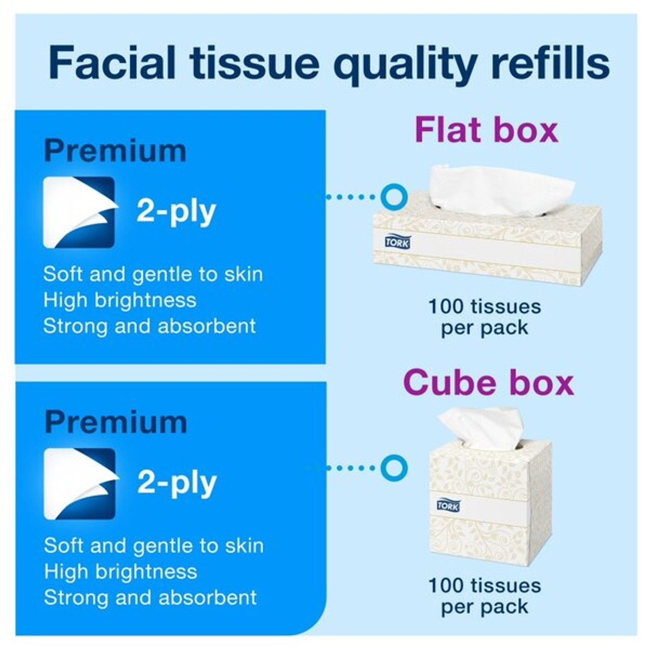 Maintaining your guests' wellbeing calls for soft facial tissues that are kind to skin. These gentle tissues give users a comfortable experience, thanks to their 2-ply Advanced quality, which provides both strength and absorbency. Plus, they create a hygienic impression for guests with their high brightness. These tissues can be easily moved and placed wherever needed, as they are supplied in a conveniently small tissue box that also protects them from dirt and dust.